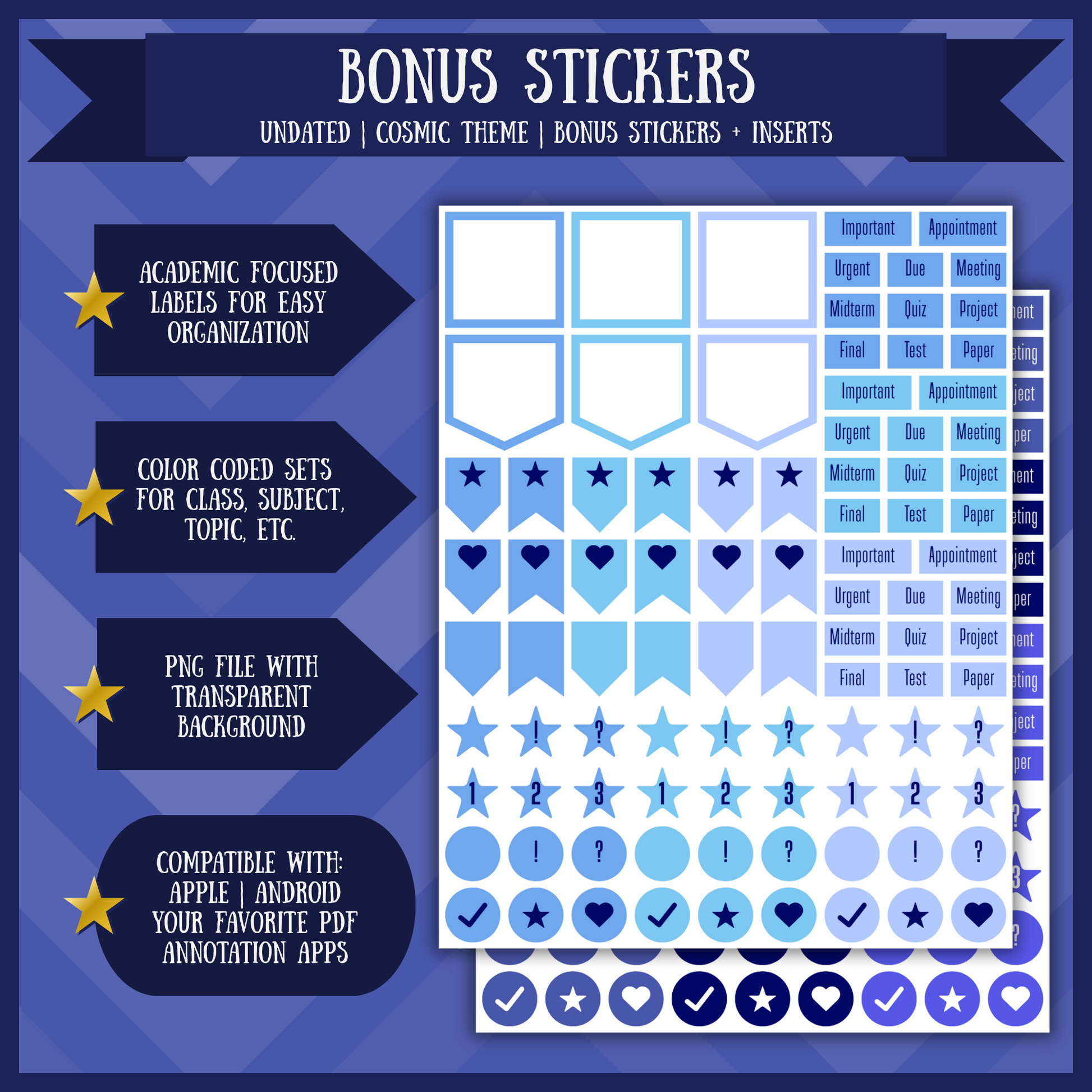 The Cosmic Academic Digital Planner features original artwork and custom designs handkrafted, just for you, to keep your academic life organized while you stay inspired by the stars! Stay focused, creative, and inspired all term long, wherever you go, with your favorite PDF annotation apps like Goodnotes, Notability, Noteshelf, Xodo, and Penly. Start using your undated planner any time in the year and reuse it term after term. With specially designed academic planning pages, celestial inserts, and digital stickers included, you’re ready to plan your semesters in stellar style!