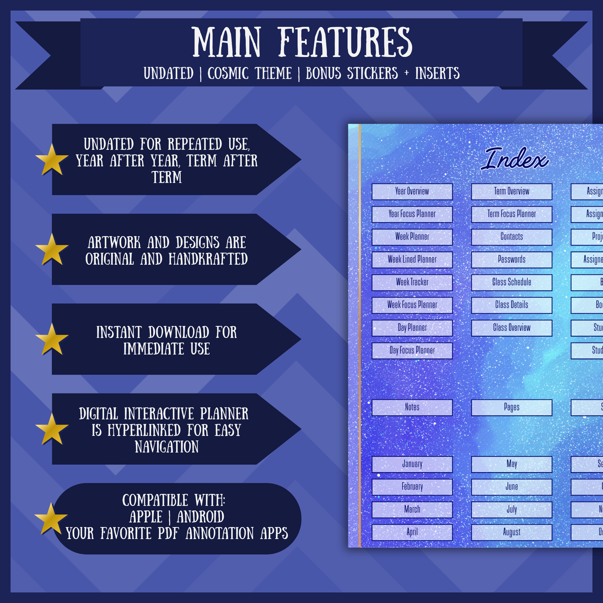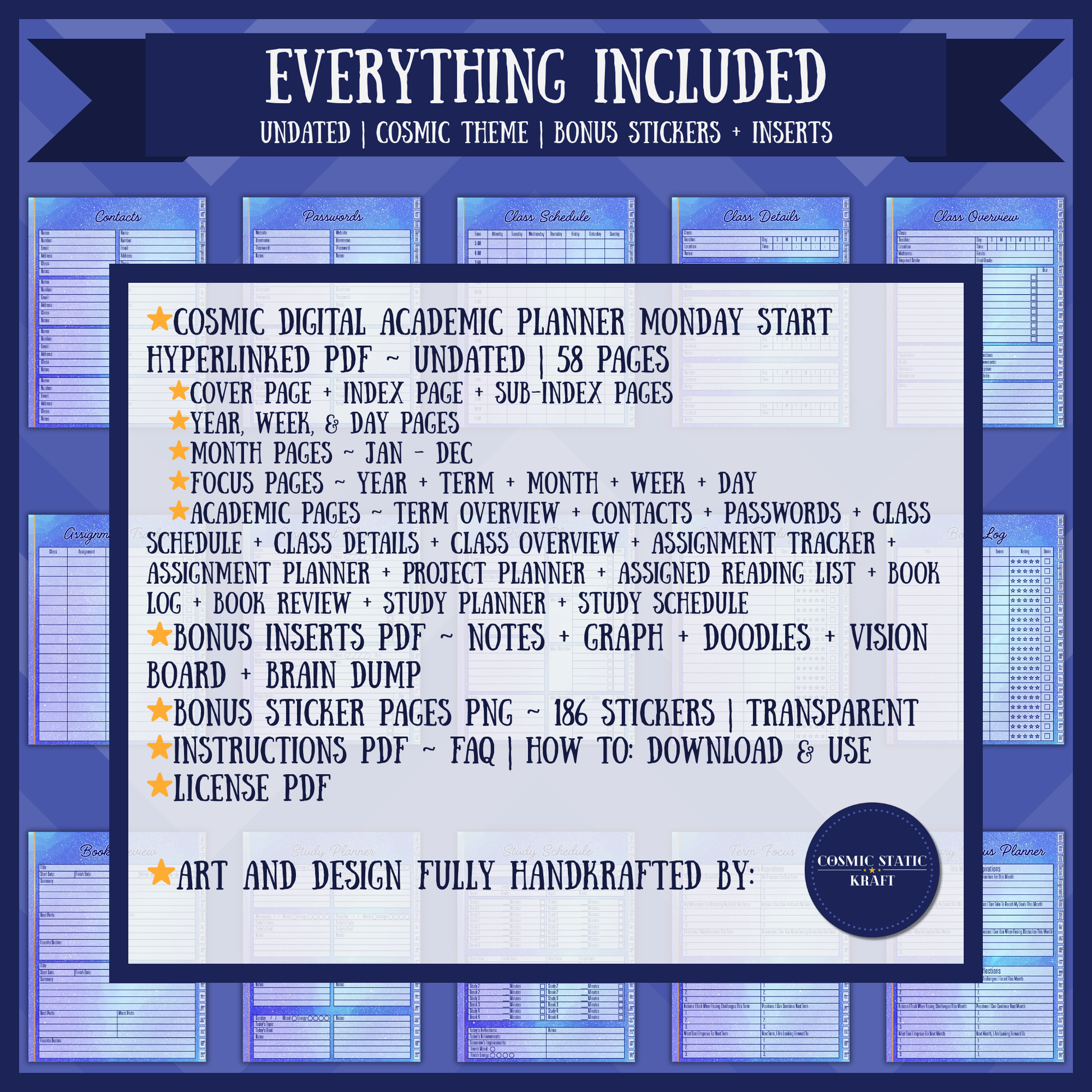 ⭐Cosmic Digital Academic Planner Monday Start Hyperlinked PDF ~ Undated | 58 pages