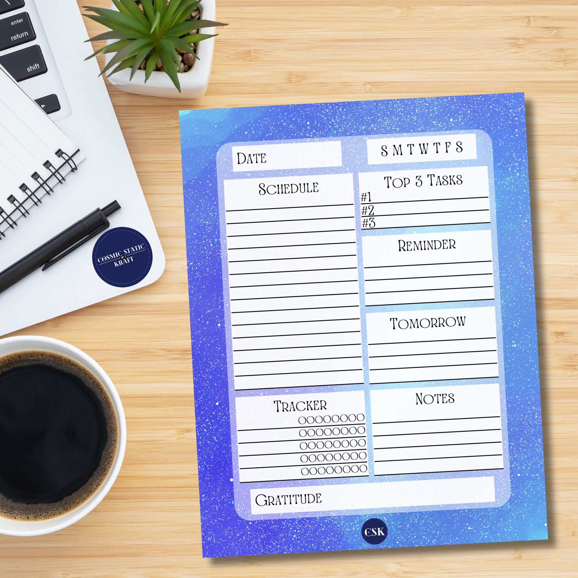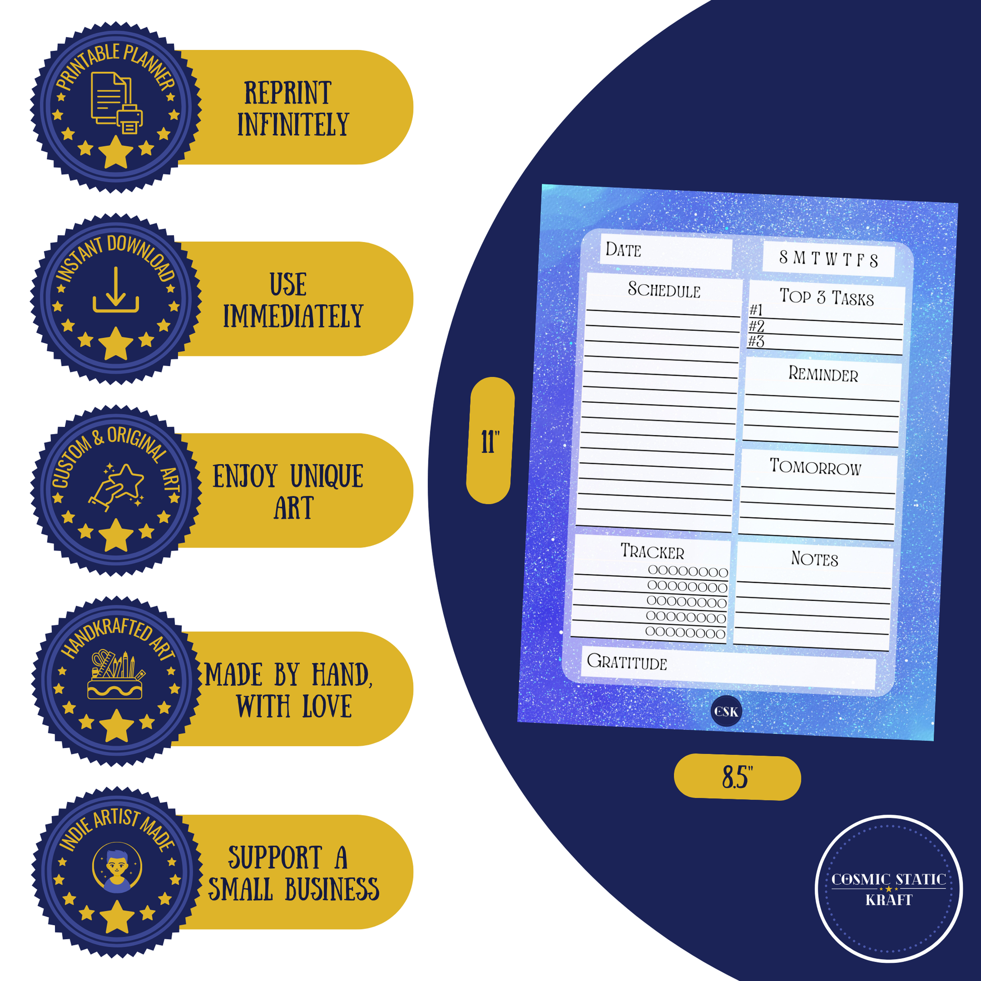 The Cosmic Printable Daily Planner features original artwork that was custom painted by hand in digital software by Cosmic Static Kraft. As a digital download, the pdf file of this planner is infinitely reusable by reprinting copies at your convenience. With artisanal aesthetics, the Cosmic Printable Daily Planner is the perfect way to start or continue your organizational journey by customizing your bullet journals, life organizers, notebooks, and more!